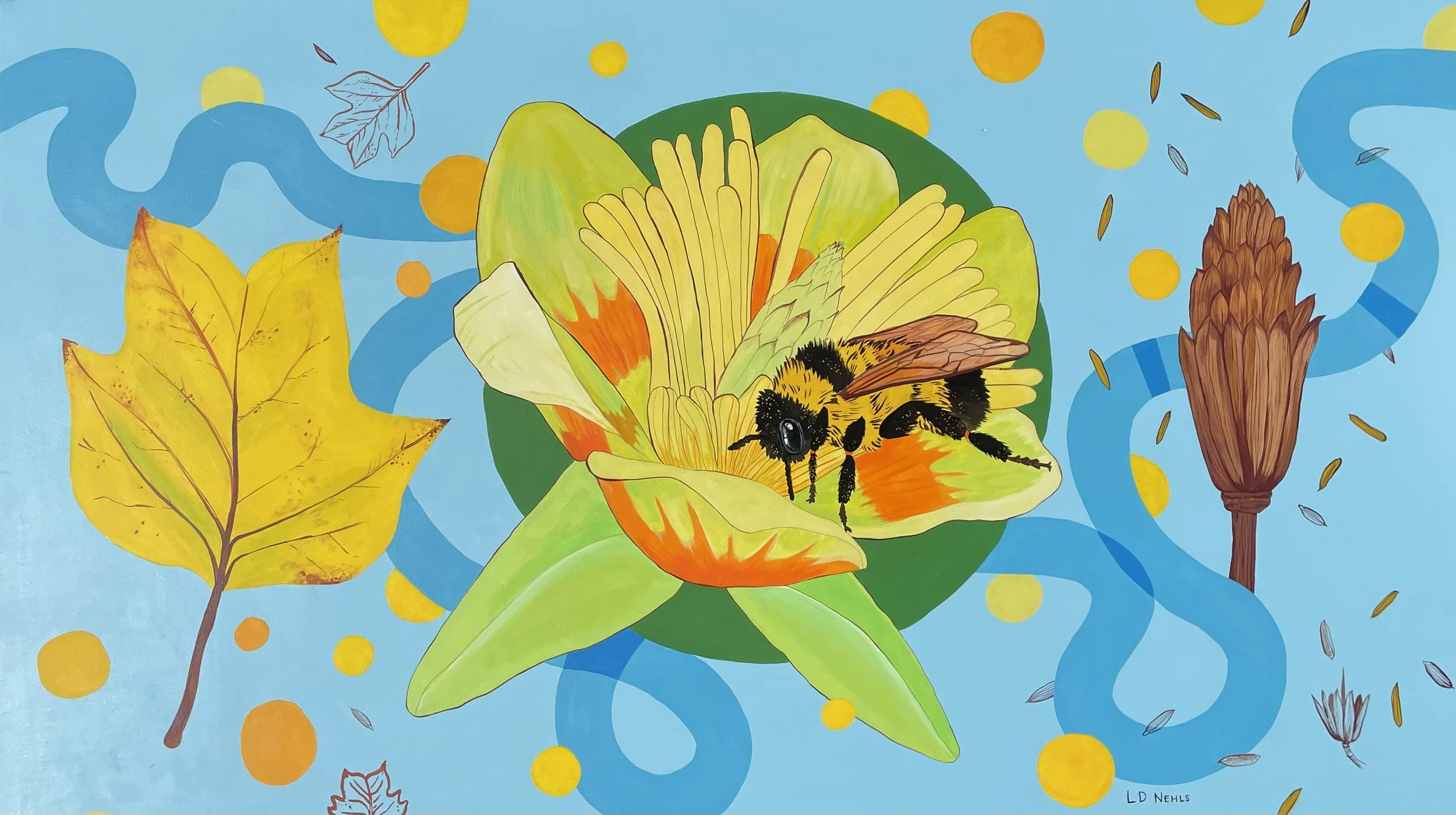 My side of this year’s triptych celebrates the native plants and native bees that can be found in the area - or, in the case of the Rusty-patched bumble bee, were once common in the area but are now endangered. I've painted this endangered bee covered in pollen on a tulip poplar flower, highlighting their role as a pollinator in the past and tying this piece to the history of the building as a historic lumber mill. The tulip poplar is the official state tree of Kentucky and I imagine that many tall, straight trunks of tulip poplars were once cut into lumber in this building. Tulip poplars can be identified by their uniquely shaped leaves which turn a brilliant yellow in the fall, their light greenish yellow and orange flowers in the spring and summer, and their brown winged seeds (samara) seen fluttering in the wind on the right side of this panel.