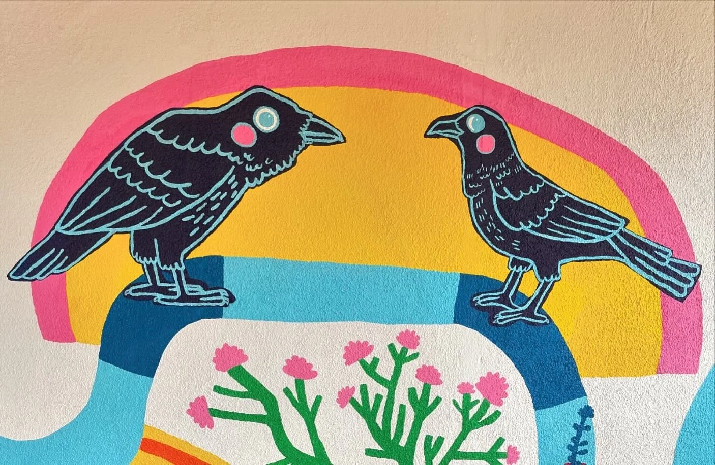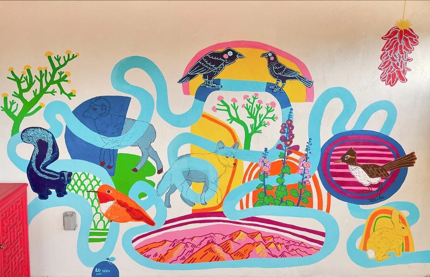 A resident of Santa Fe saw a mural I created that celebrated the plants and animals of Cincinnati and requested a similar design, but featuring species found in Santa Fe, New Mexico. I traveled to Santa Fe in May of 2024 to paint this mural on the side of her beautiful adobe home and fell in love with New Mexico. This was truly a dream project in every way, and I am so grateful for the trust and creative freedom on the mural.