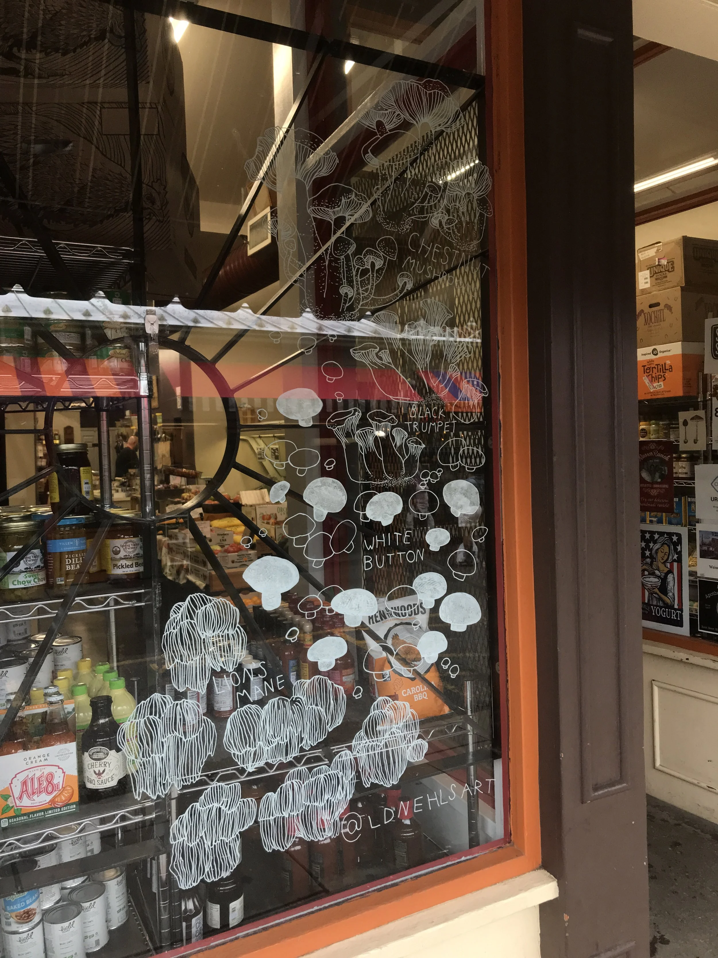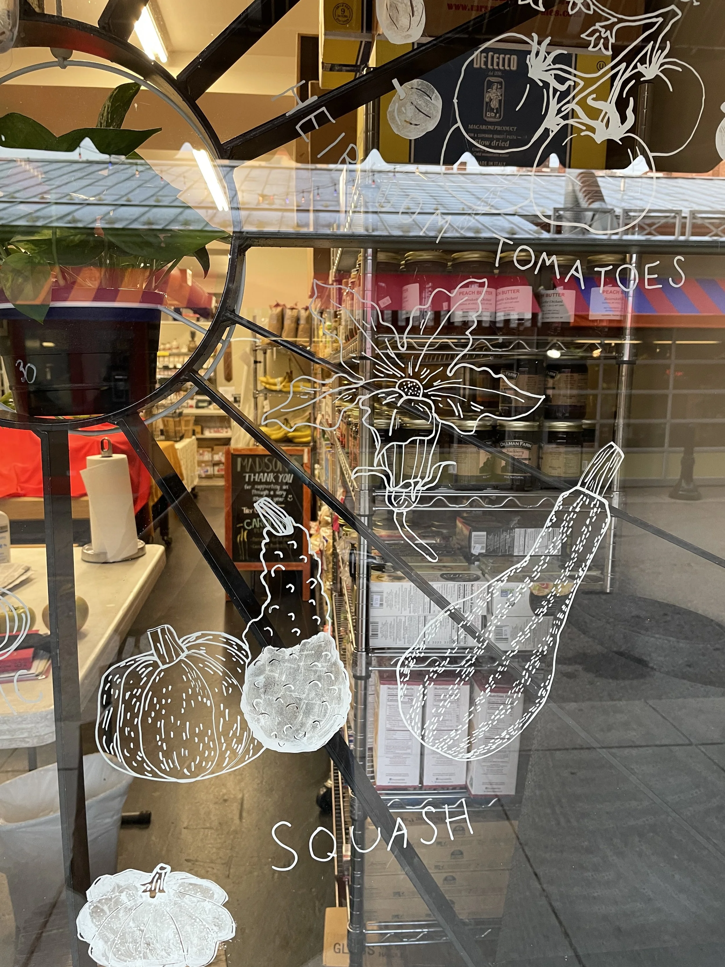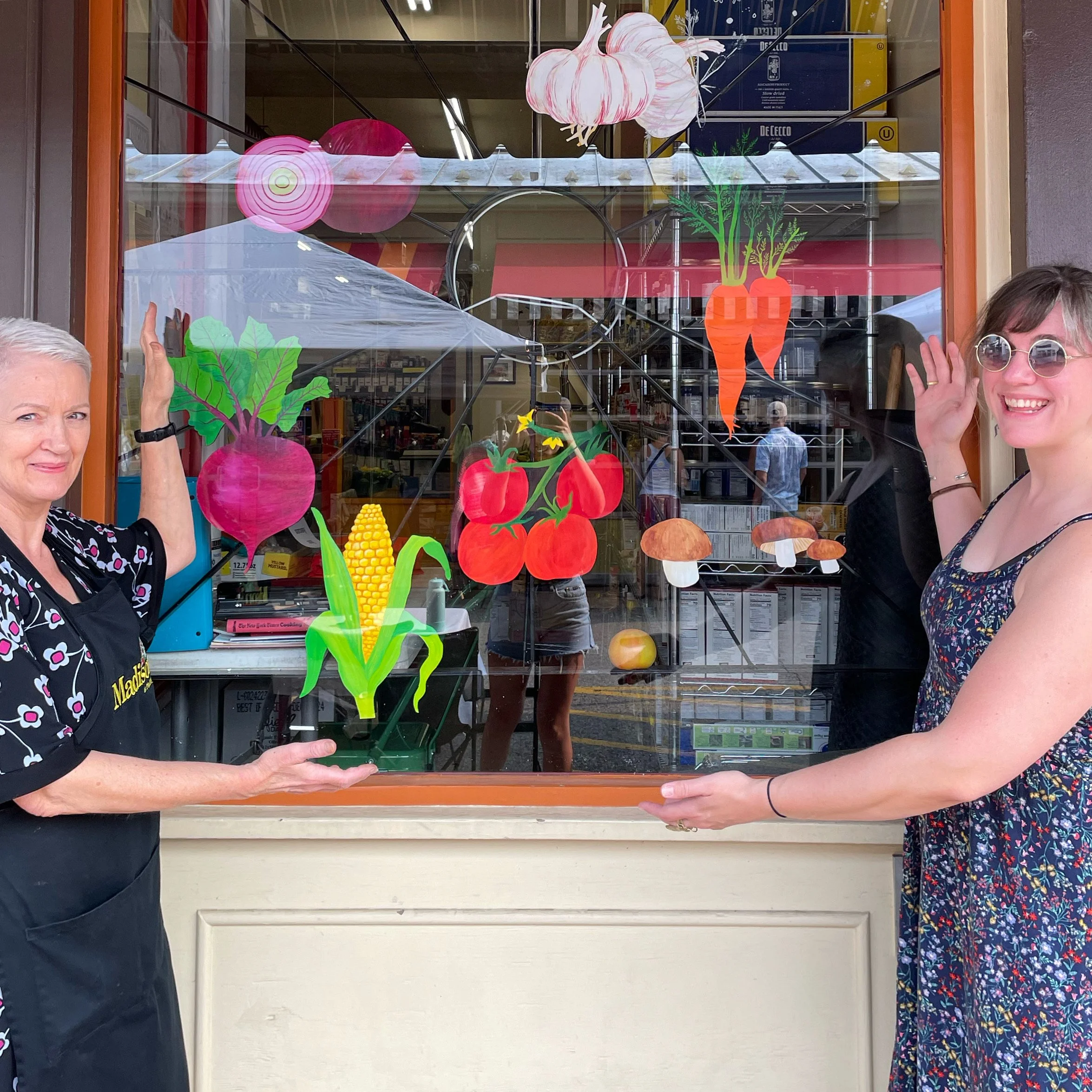 Each piece of this window display is painted on a thin but durable sheet of wood and hung from fishing line so that Madison’s at Findlay Market can swap out the elements of the display to show what is in season and available in their storefront. Their famous local sweet corn has a devoted following and “putting the corn in the window day” has been a fun tradition for two summers and counting!