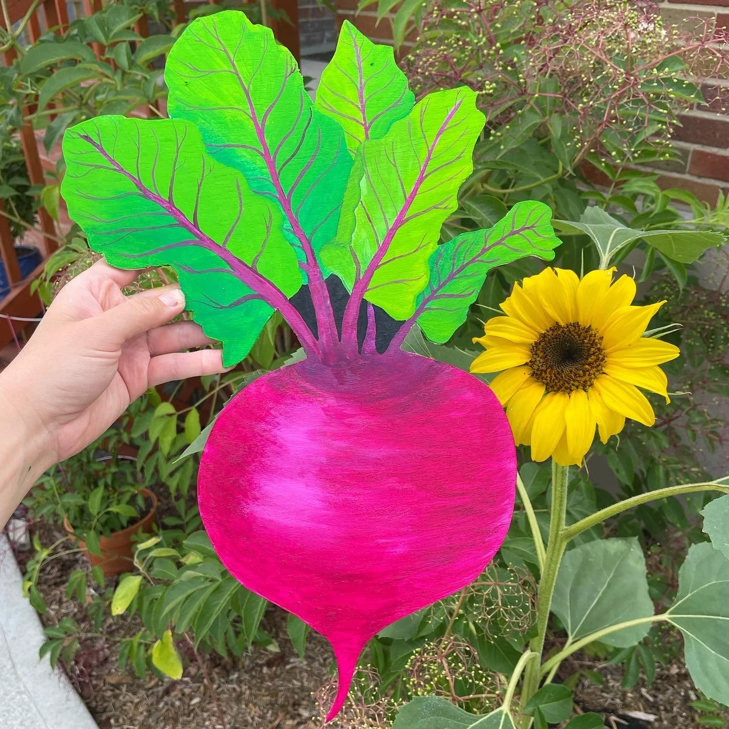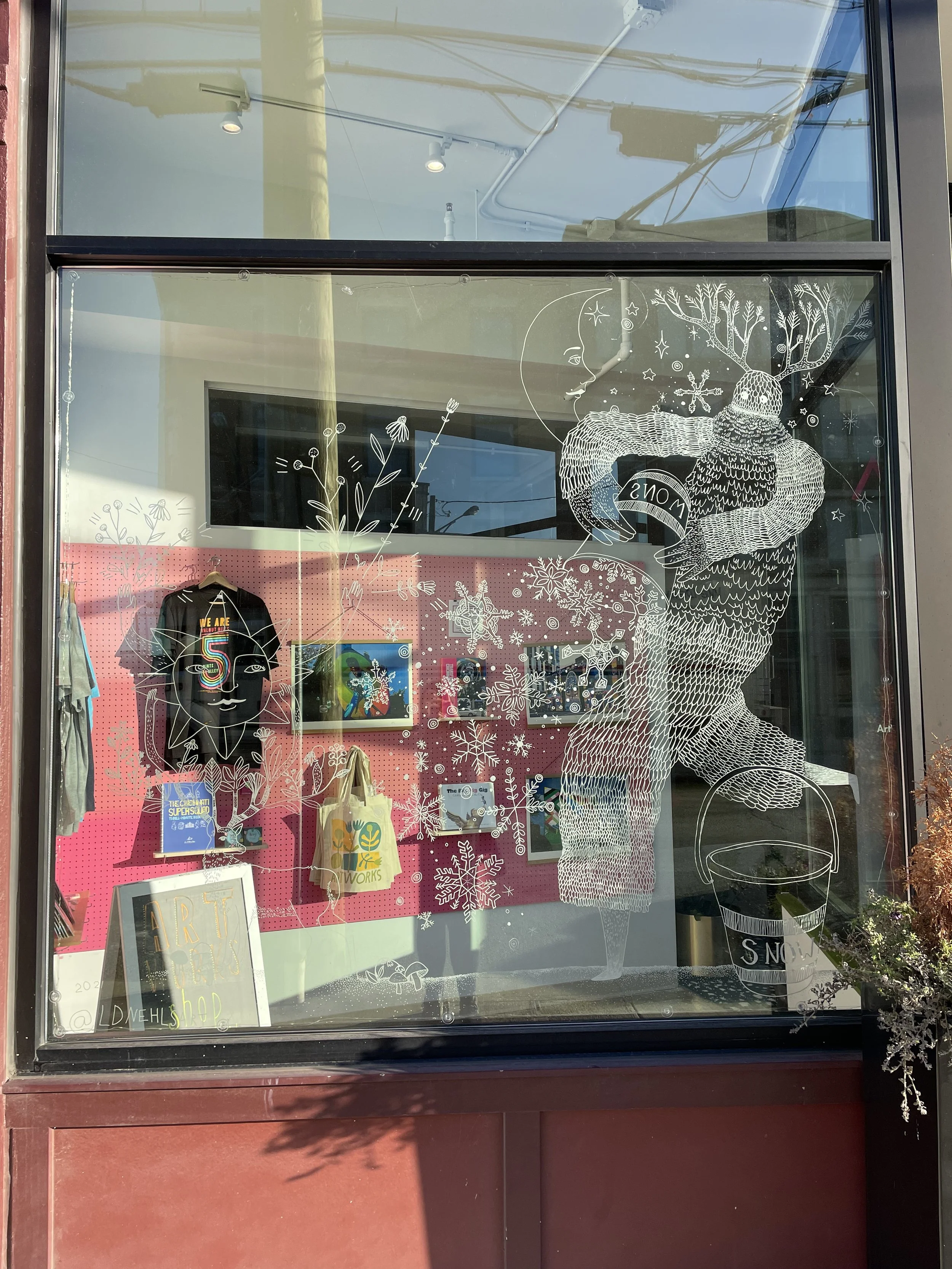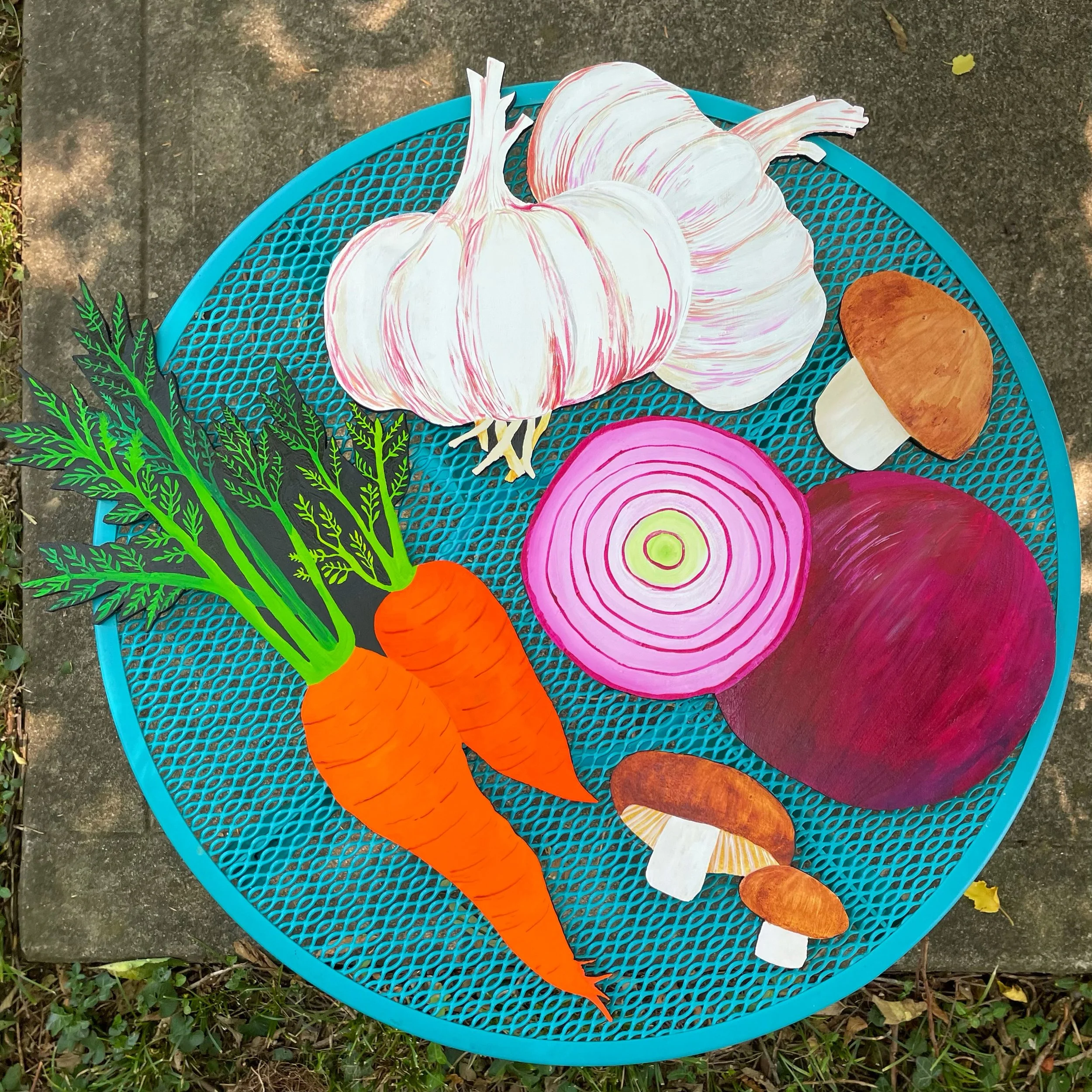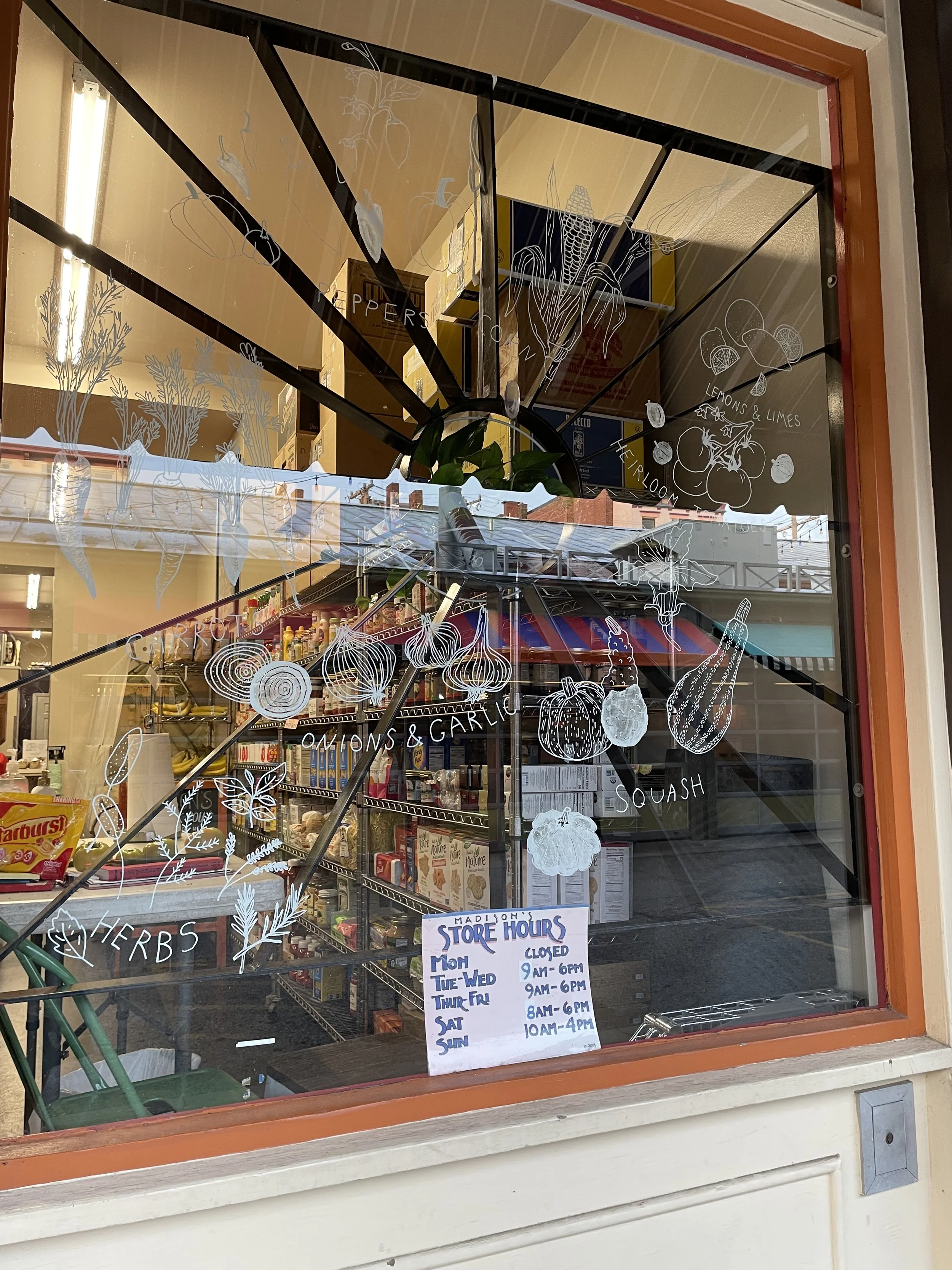 Each piece of this window display is painted on a thin but durable sheet of wood and hung from fishing line so that Madison’s at Findlay Market can swap out the elements of the display to show what is in season and available in their storefront. Their famous local sweet corn has a devoted following and “putting the corn in the window day” has been a fun tradition for two summers and counting!